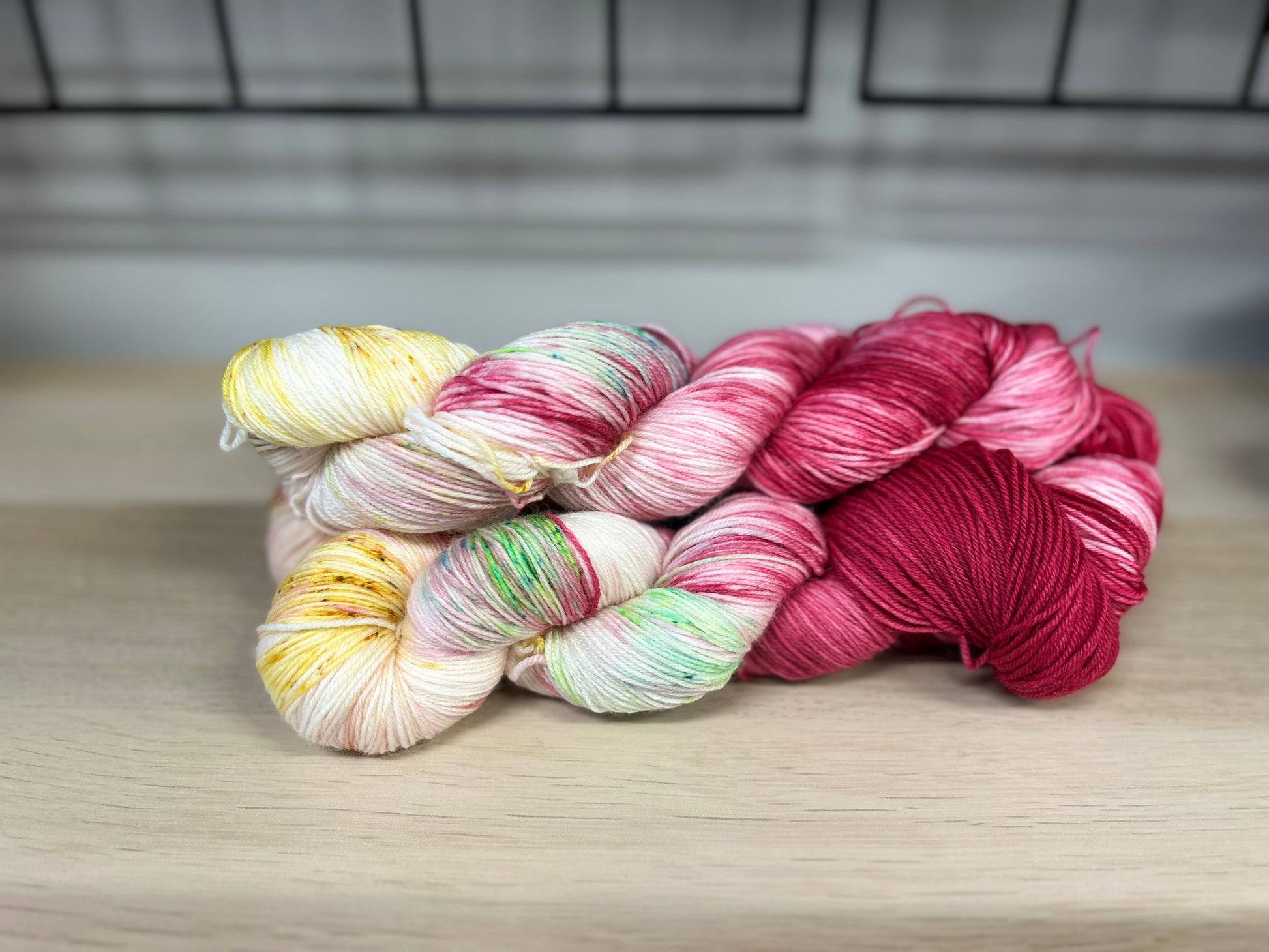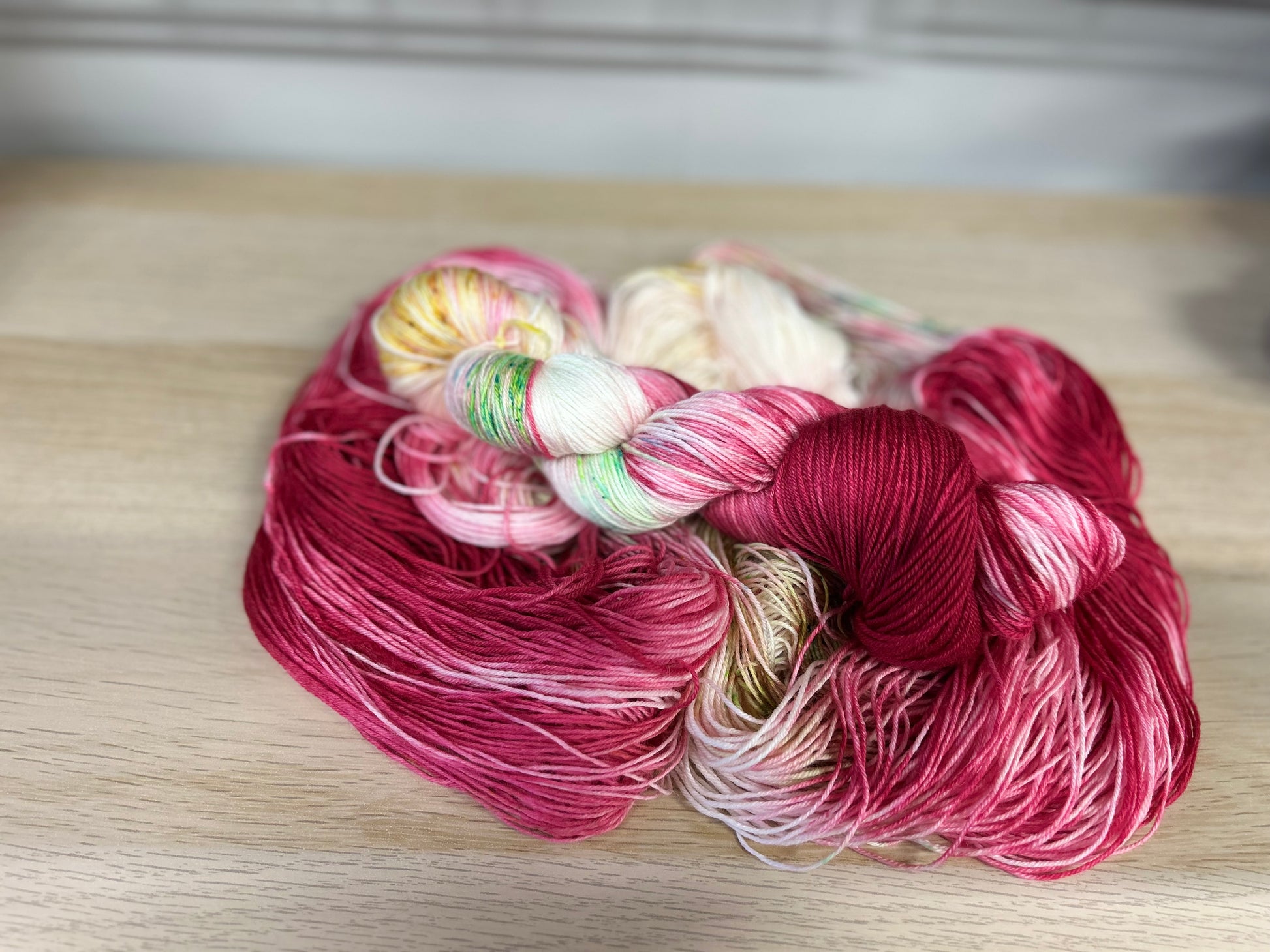 Each skein is 100g / 430yards of 80% Superwash Merino, 20% Nylon