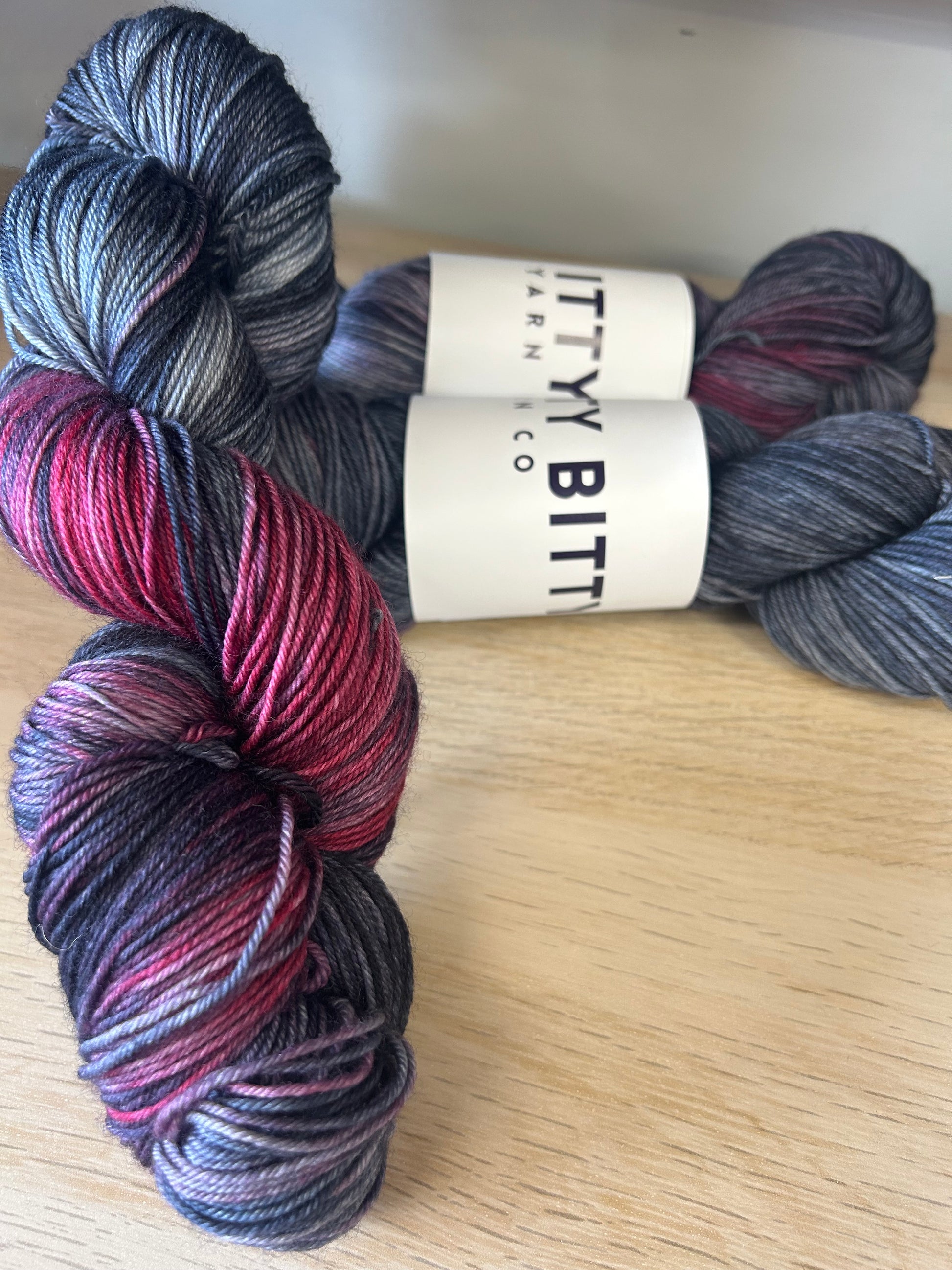 Each skein is 100g / 430yards of 80% Superwash Merino, 20% Nylon